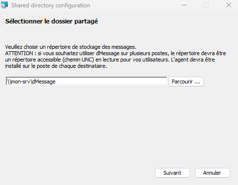 Prenez garde à bien définir le chemin UNC du répertoire partagé lorsqu'il est demandé. Pour le bon fonctionnement de dMessage, il doit impérativement être le même pour tous les postes.